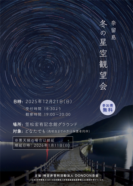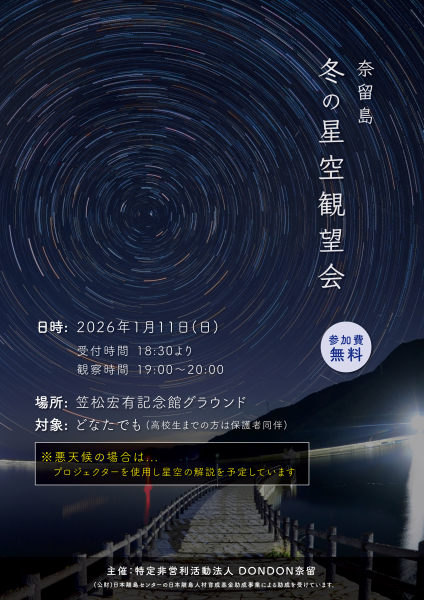 「冬の星空観望会」は令和8年11月11日に順延になりました 12月21日の「冬の星空観望会」は、天候不順が予想される為、来年1月11日に延期します。尚、当日悪天候の場合は笠松宏有記念館、館内にてプロジェクターによる奈留島の星景写真などを案内します。